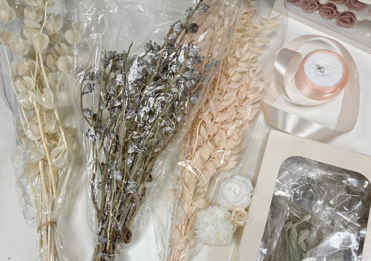 После обсуждения референсов, мы встретились в мастерской для обсуждения подходящих сухоцветов и стабилизированных растений. Выбрали цветовую гамму и утвердили состав. Основу композиций составили стабилизированные и высушенные розочки, фрезии, диаунтусы и эвкалипт.