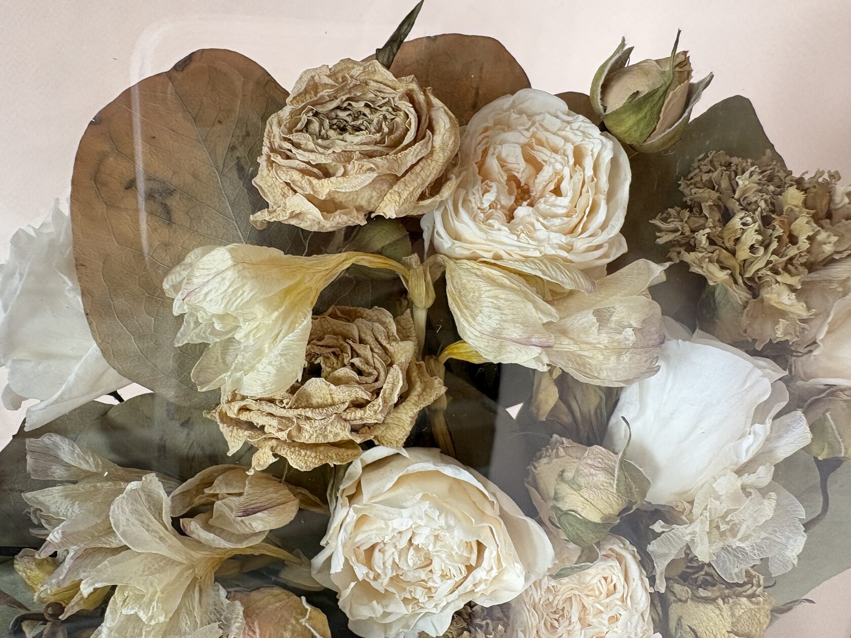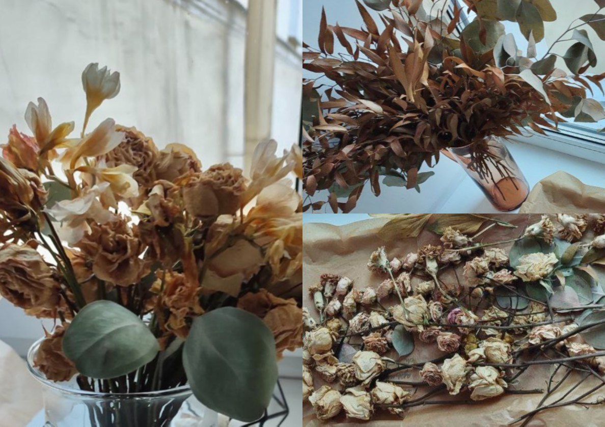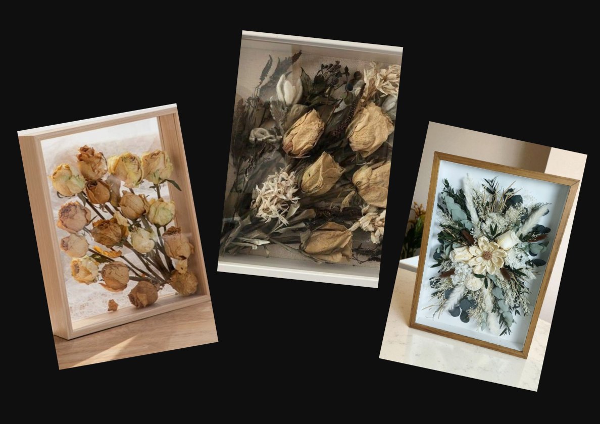 В мастерскую SUHOCVETIKA обратилась девушка с просьбой изготовить панно из имеющихся у неё цветов. Цветы остались со свадьбы, но со временем они приобрели естественный для высушенных цветов пожелтевший вид и стали хрупкими. Хотелось сохранить это воспоминание о радостном и важном дне на долгое время, но при этом придать цветам более "свежий" вид.